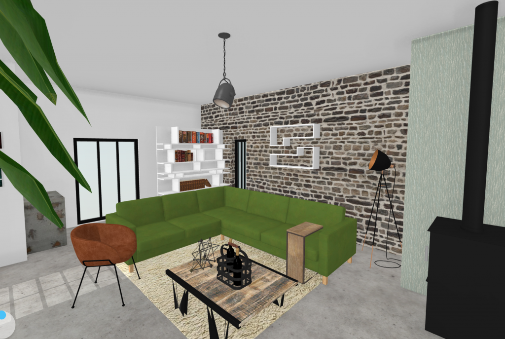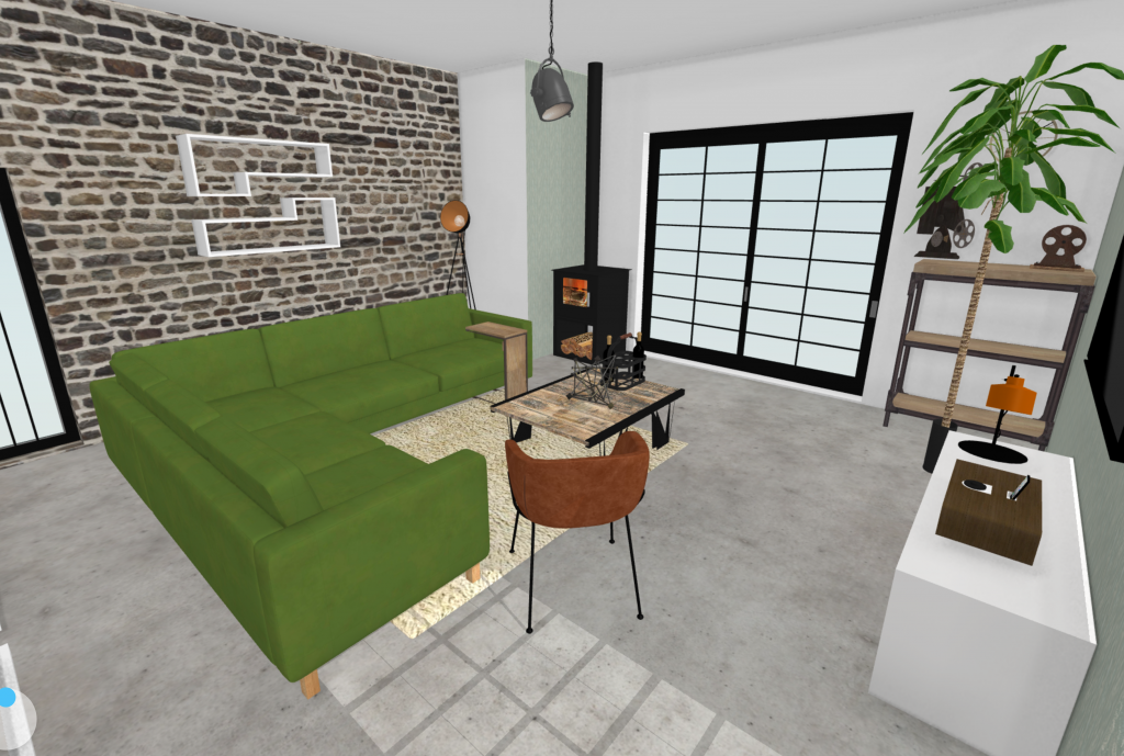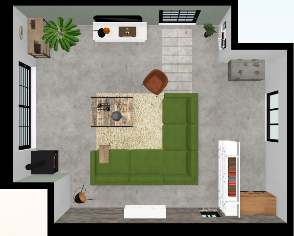 In bovenstaand voorbeeld wilden de bewoners een niet zichtbare werkplek, zonder het ruime karakter van de ruimte te verliezen. Ook wilden ze de groene bank behouden, maar de ruimte een meer industrieel karakter geven zonder het natuurgevoel te verliezen.